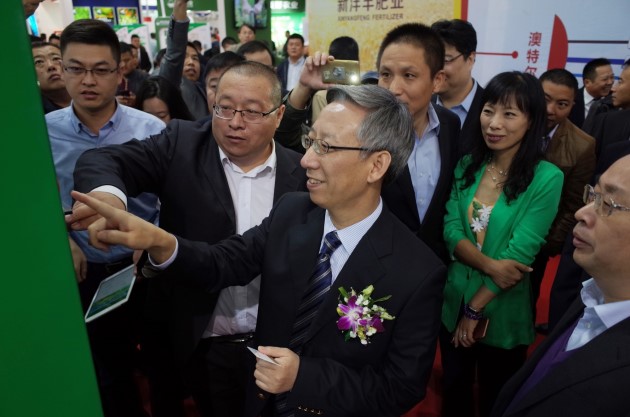 楊建平主任和李壽生會長在人群的簇擁下,分別來到中農控股展臺,聽取了中農控股工作人員關于“中國農資”第三代智能液體加肥機等情況介紹,并進行了現場操作,都連連說好。