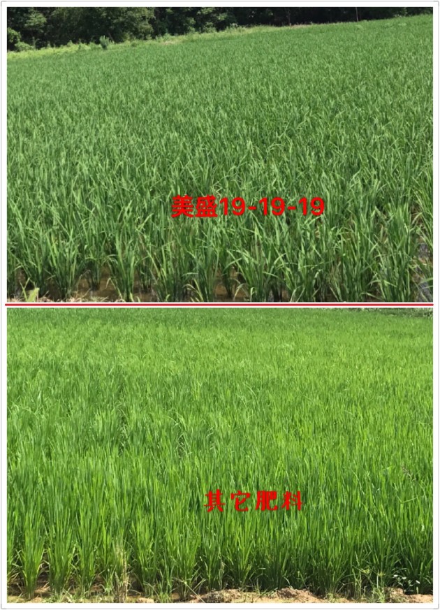 在佳源合作社的再生稻試驗(yàn)示范田里,皂市店的技術(shù)顧問程兵祥興奮地說:“我們合作社種的再生稻品種和別人家的一樣,但是我們的長(zhǎng)得就是好,我們用美盛19-19-19肥料作底肥,一袋兩畝地。你看,我們的再生稻,拔起來的根,根系多還很發(fā)達(dá),而且分蘗多,莖稈也挺拔有力,葉片也是濃綠寬大,秧苗長(zhǎng)得壯還整齊。我們后期還要追一次晶體鉀,等抽穗后相信效果會(huì)更明顯。”