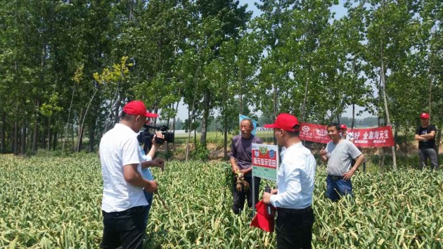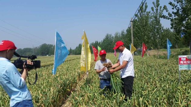 5月18日,中農控股產品研發營銷中心一部的山東省區經理陳冬燁、區域經理陳登建、百優農資公司全體員工、當地縣各鄉鎮合作伙伴、種植大戶、當地電視臺記者組成“海元寶”大蒜觀摩團,一起走訪了金鄉縣羊山村等周邊5個村的“海元寶”大蒜示范田,見證了海元寶肥料的神奇肥效。
