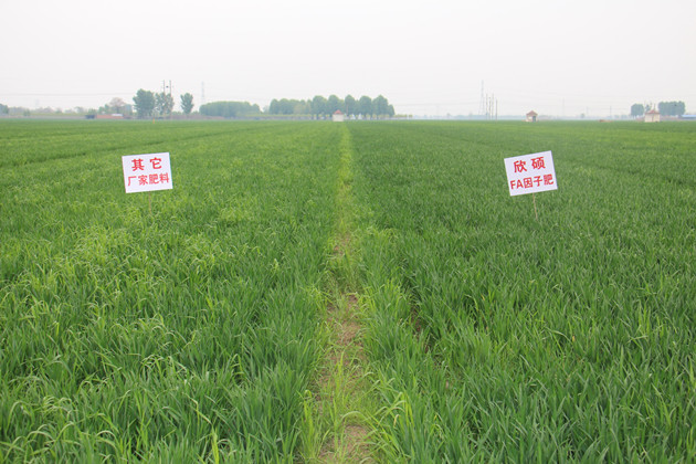 ? ? 示范戶羅永來向參會的經銷商和種植戶介紹說:“我已經連續使用‘欣碩’FA因子功能肥兩年了,小麥用‘欣碩’18-22-5的功能肥、玉米用‘欣碩’30-5-5的功能肥,施用‘欣碩’FA因子的小麥播種后,小麥早、出苗齊,植株健壯、分蘗率高、葉片的顏色也比較深,春天返青還早,成穗率也比用普通肥料的高,通過這兩年的田間效果,我對‘欣碩’FA因子功能肥是越來越有信心了?!彪S后,新樂中農技術人員向參觀人員詳細講解了“欣碩”FA因子系列產品的特點,針對小麥施用“欣碩”FA因子系列產品應該注意的事項重點介紹,同時,對大家關心的小麥的后期管理和病蟲害防治等方面知識進行現場答疑。