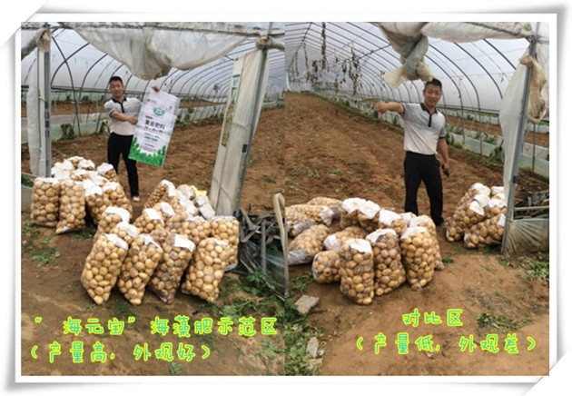 ? ? 回訪之際正是大棚馬鈴薯采收期,中農控股農化人員對試驗田馬鈴薯進行現場測產。經裝袋稱重和品質比對,“海元寶”海藻肥試驗棚收獲的35袋馬鈴薯中,一等品達15袋,對比棚24袋馬鈴薯中一等品僅為8袋。當切實感受到“海元寶”海藻肥增產和提高作物品質的突出肥效后,基地負責人對該新型肥料及其試驗效果非常滿意,并表示以后基地用肥就用“海元寶”海藻肥,而且不僅自己用,還要在合作社內積極推薦和推廣,帶領廣大社員共同致富。