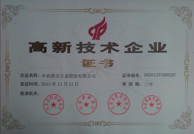 ? ? 日前,中農舜天生態肥業有限公司(“中農舜天”)榮獲山東省科技廳、山東省財政廳、山東省國家稅務局、山東省地方稅務局聯合頒發的“高新技術企業”證書。