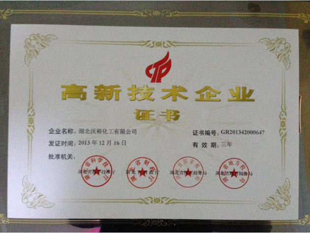 ? ? 經湖北省科技廳、湖北省財政廳、湖北省國稅局、湖北省地稅局組織專家評審,湖北沃裕化工有限公司(以下簡稱“湖北沃裕”)最終獲評“高新技術企業”,該項榮譽的獲得為湖北沃裕的發展注入了新的活力。