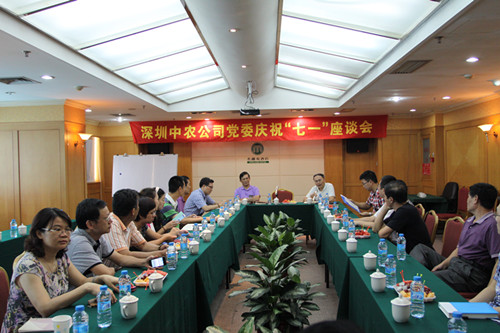 ? ? ? 7月1日,深圳市中農(nóng)生產(chǎn)資料有限公司(簡稱“深圳中農(nóng)”)黨委在深圳中農(nóng)大廈舉行座談會,紀(jì)念中國共產(chǎn)黨誕辰92周年。來自深圳中農(nóng)本部、各控股公司支部的黨員30余人參加座談。座談會由深圳中農(nóng)黨委委員、黨辦主任馬立鶴主持。?????座談會上,深圳中農(nóng)董事長兼總經(jīng)理肖建國與大家共同回顧了深圳中農(nóng)從黨支部組建、擴大到黨總支成立20年來的發(fā)展歷程。在談到公司黨建工作時,肖建國說,目前深圳中農(nóng)面臨著內(nèi)外部的挑戰(zhàn)和改革發(fā)展的壓力,黨組織的政治優(yōu)勢要向競爭優(yōu)勢和發(fā)展優(yōu)勢的方向轉(zhuǎn)化,不管公司管理模式發(fā)生何種變化,作為一名共產(chǎn)黨員,都應(yīng)該保持堅定的政治信念,堅持黨性原則,保持共產(chǎn)黨員先進性,在日常生活中以黨員的標(biāo)準(zhǔn)嚴(yán)格要求自己。?????隨后,公司黨委、紀(jì)委成員和各支部黨員代表暢所欲言、各抒己見,分別結(jié)合各自的入黨經(jīng)歷、學(xué)習(xí)、工作和生活實踐,暢談了在黨建工作中的經(jīng)驗和體會,抒發(fā)了立足本職崗位,發(fā)揮共產(chǎn)黨員先鋒模范作用的感想,并結(jié)合業(yè)務(wù)發(fā)展提出了諸多積極建議。來自駐深農(nóng)資企業(yè)的退休黨員陳永蓮在發(fā)言中對深圳中農(nóng)黨委給予的關(guān)懷表示感謝,黨委開展的有聲有色的黨建活動讓他們充分體會到了黨組織的歸屬感和榮譽感。????最后,肖建國希望各黨支部要充分發(fā)揮組織領(lǐng)導(dǎo)作用,各黨員更要以身作則,在公司轉(zhuǎn)型之際,同舟共濟、齊心協(xié)力,發(fā)揮戰(zhàn)斗堡壘和模范作用,將每個黨員、每個員工的夢匯聚成深圳中農(nóng)的夢,更好地推動深圳中農(nóng)不斷發(fā)展。
